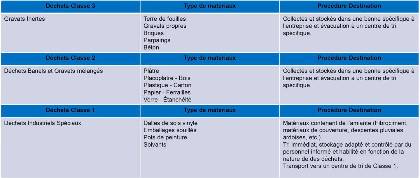 Tous les déchets résultant des travaux liés à l’activité de l’entreprise sont immédiatement triés à la source et sont évacués, recyclés ou traités selon le tableau ci-dessous.